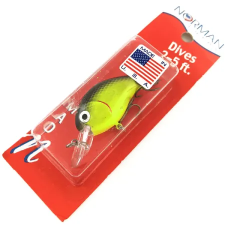Con un'azione di nuoto tra 0,6 e 1,5 m (2-5 piedi), questo crankbait shallow-running presenta la classica colorazione ad alta visibilità Chart / Nero / Arancione, identificata dal codice colore MAD-21. Questo esemplare, con codice prodotto 11352, è un'esca da 11g (2/5oz) che misura esattamente 5cm (2") di lunghezza. Valutato 6, è inutilizzato e conservato nella sua confezione vintage originale bianca e rossa. La paletta trasparente è integrata in un corpo compatto progettato sia per il casting che per la traina. Sul retro del cartoncino è ancora visibile la guida dettagliata 'Tuning a Crankbait' e la tabella peso/lunghezza tipica della produzione Norman di Greenwood, Arkansas. La costruzione include l'iconico adesivo con la bandiera 'Made in U.S.A.' in evidenza sulla bolla di plastica. La finitura è caratterizzata da una base chartreuse neon brillante con una striscia nera solida lungo il dorso e un distintivo accento arancione vicino alla pancia e alla gola.