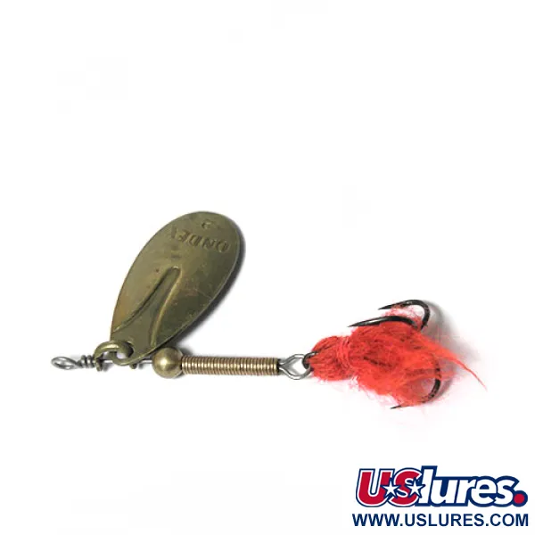 Sulla pala in ottone è chiaramente impresso il marchio ONDEX 2, che identifica un classico cucchiaino rotante di produzione francese con profonde radici nella storia della pesca europea. Con un peso di soli 2 g (1/16 oz), questo artificiale ultraleggero è costruito su un asse metallico semplice con una perla di ottone e una molla distanziatrice a spirale. Il ciuffo di lana rossa sull'ancoretta rimane vivace e folto, fornendo un netto contrasto visivo con la finitura in ottone. Lungo 4,5 cm (1 3/4"), questo esemplare con codice prodotto 0028 mostra componenti metallici ben conservati, meritando una valutazione di condizione 4/5 per le sue superfici pulite. I rotanti Ondex sono storicamente famosi per la loro capacità di entrare in rotazione nel momento stesso in cui toccano l'acqua, una necessità tecnica per questi piccoli design francesi spesso utilizzati per presentazioni delicate in torrente.