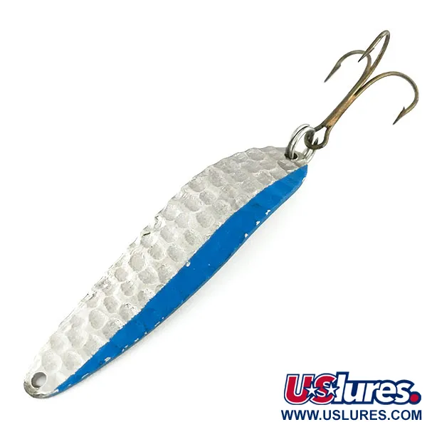 Una decisa striscia blu corre lungo il bordo esterno di questo ondulante in nichel da 6,7 cm (2 3/4"), offrendo un netto contrasto visivo con il corpo argentato. Prodotto negli USA, questo Gator Ottogator è valutato 5/5 per le sue condizioni, mostrando una superficie brillante e riflettente sia sulla faccia martellata che su quella liscia. Il peso di 12g (2/5oz) fornisce la massa necessaria per lanci stabili e una profondità controllata durante il recupero. Sul lato anteriore, la texture martellata è profonda per catturare la luce da ogni angolazione, mentre il retro presenta una finitura pulita e lucida con il marchio Ottogator stampato. Identificato dal codice prodotto 9267, l'esemplare è armato con un robusto anellino spaccato e un'ancoretta affilata che mostra pochissimi segni del tempo.