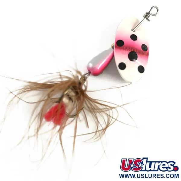 I puntini neri su una pala sfumata bianca e rosa rendono questo rotante da 3,5 cm (1 1/2") un pezzo immancabile per ogni pescatore a light spinning. Questo specifico modello Panther Martin 1, codice 4374, pesa 2 g (1/16 oz) e mette in mostra la tradizionale maestria artigianale italiana del marchio. Il corpo a goccia è diviso tra una parte superiore argentata e una pancia rosa, terminando con un'ancoretta piumata legata con hackle marrone e un punto d'attacco in lana rossa. Poiché la condizione è 6, l'esca è inutilizzata, esattamente come uscita dalla fabbrica in Italia. Il design con pala passante sull'asse è il marchio di fabbrica del produttore, studiato per far girare la pala immediatamente al contatto con l'acqua. Una pallina dorata separa il corpo appesantito dal gruppo dell'amo, garantendo una rotazione fluida e un corretto bilanciamento. Per chi conosce la serie di colori Trout, la combinazione di motivi maculati e piume naturali offre una presentazione altamente dettagliata in dimensioni ridotte.
