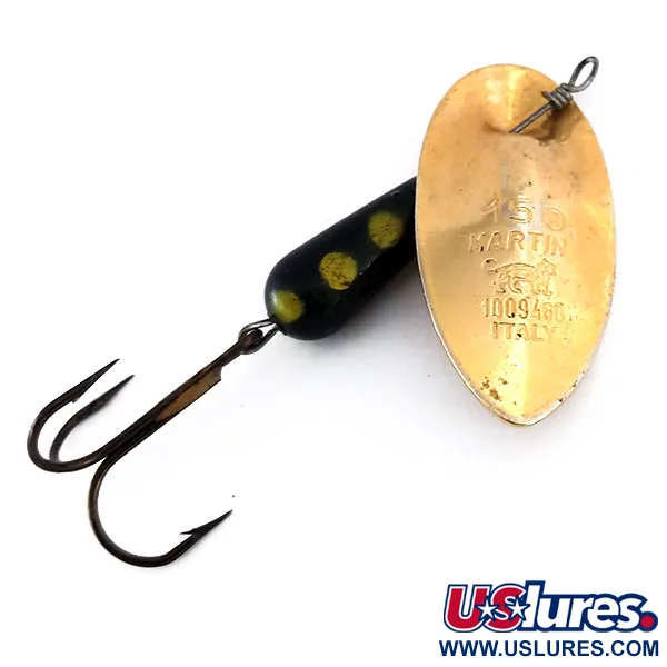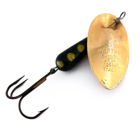 Il classico logo Panther Martin con il leone è stampato direttamente sulla paletta dorata, insieme alla scritta 'Italy' e al numero 15. Con un peso di 1/2oz (15g), questo cucchiaino rotante riporta il codice prodotto 10134 e presenta il caratteristico montaggio della paletta in-line, dove l'asse passa direttamente attraverso il metallo. Il corpo zavorrato è a forma di goccia, rifinito in nero con tre punti gialli brillanti per contrasto. Con una lunghezza di 2 3/4" (7cm), l'esca è conservata in condizioni 5/5 e mantiene il suo amo triplo originale con finitura bronzo. La paletta color oro presenta anche il timbro numerico 1009460, un segno distintivo di questi vecchi esemplari di produzione italiana.