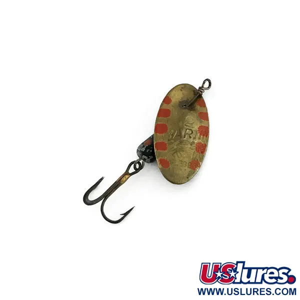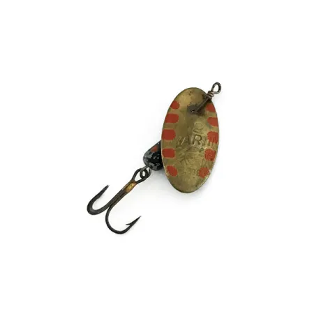 Sulla superficie convessa della paletta in ottone sono chiaramente stampati i marchi "MARTIN" e "ITALY", che identificano l'origine di questo esemplare. Questo Panther Martin 2 vintage, catalogato con il codice prodotto 9530, presenta il caratteristico montaggio della paletta passante sull'asse che ha definito il profilo del marchio. La paletta è rifinita con tratti verticali rossi lungo i bordi, che offrono un netto contrasto con il corpo nero a forma di goccia, decorato con piccoli punti rossi e arancioni. Con un peso di 2,5 g (3/32 oz) e una lunghezza di 3,5 cm (1 1/2"), è una misura classica per la pesca alla trota in torrente. Le condizioni sono valutate 4/5, con una leggera e onesta usura sulle superfici in ottone e verniciate che ne riflette la storia. La dotazione originale include un'ancoretta singola attaccata al retro del corpo zavorrato. L'asse metallico è dritto e l'assemblaggio rimane solido, tipico della qualità costruttiva italiana della metà del secolo riscontrabile in questi primi cucchiaini rotanti.
