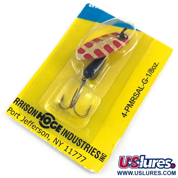 Con un peso di 4 g, questo classico cucchiaino rotante utilizza una paletta dorata decorata con caratteristici punti rossi. L'esca è costruita con il design della paletta ad asse passante che ne consente la rotazione direttamente sul filo. Con il codice prodotto 4372, questo esemplare rimane nella sua confezione originale Harrison Hoge Industries, con l'indirizzo di Port Jefferson, NY. Essendo inutilizzato, la finitura scura del corpo a goccia appesantito e l'ancoretta sono in perfetto stato di conservazione. Il cartoncino presenta il tradizionale branding giallo e blu, con un'offerta promozionale vintage sul retro e una foto di pesca in bianco e nero. Questo modello specifico, siglato 4-PMRSAL-G, presenta la struttura da 4,5 cm che ha reso Panther Martin un punto fermo per i pescatori di trote e persici. La confezione riporta anche il sito web del produttore e l'indirizzo di Columbia St., segnando un'era specifica nella storia della produzione del marchio.