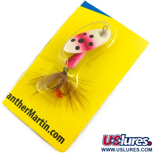 Con un peso di 4 g (1/8 oz), questo cucchiaino rotante in linea mette in mostra la distintiva livrea 'Trota' grazie a una palletta bianca decorata con una striscia longitudinale rosa e puntini neri. L'esca da 5 cm (2") presenta il classico design Panther Martin in cui la palletta è montata direttamente sull'asse, una configurazione pensata per favorire la rotazione immediata. Questo esemplare, con codice prodotto 4601, è conservato sulla sua scheda originale giallo brillante, distribuita da Harrison Hoge Industries. Il corpo a goccia è rifinito in una tonalità rosa pieno, coordinata con i dettagli della palletta, e termina con un'ancoretta piumata con morbide piume marroni. Conservato in condizioni mai utilizzate, le parti metalliche rimangono lucide e la confezione è ben integra. Originariamente progettati in Italia, questi rotanti sono apprezzati per i loro corpi appesantiti che aiutano nel lancio a distanza. Il retro della scheda fornisce il contesto storico della distribuzione del marchio da Port Jefferson, NY, evidenziando le palette placcate o olografiche progettate per riflettere la luce in varie condizioni d'acqua.