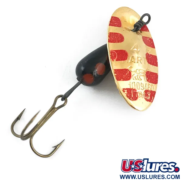 Chiaramente impresso sulla superficie convessa della lama dorata, il marchio di origine "Italy" conferma questo Panther Martin 4 come un autentico pezzo di artigianato europeo. Questo cucchiaino rotante da 1/8oz (4g) presenta una combinazione cromatica ad alto contrasto, che unisce una lama dorata ornata da strisce rosse diagonali e un corpo a goccia nero decorato con tre distinti punti rossi. Con una lunghezza totale di 1 1/2" (4 cm), il design sfrutta il sistema brevettato a lama passante, dove l'asse attraversa direttamente la lama, un segno distintivo dell'ingegneria del marchio. Una piccola perla in ottone fornisce lo spazio necessario tra il corpo appesantito e la componente rotante. Le diciture sulla lama includono anche l'indicatore di misura "4 MARTIN" e il numero di brevetto 1009460. Classificato in condizioni 5/5, le strisce e i punti verniciati rimangono vivaci, mentre i componenti metallici conservano la loro lucentezza originale. L'ancoretta è rifinita in una discreta tonalità bronzo, fissata saldamente al telaio in acciaio. Il codice prodotto 4676 identifica questa specifica configurazione, caratterizzata dall'esclusiva decorazione della lama a strisce.