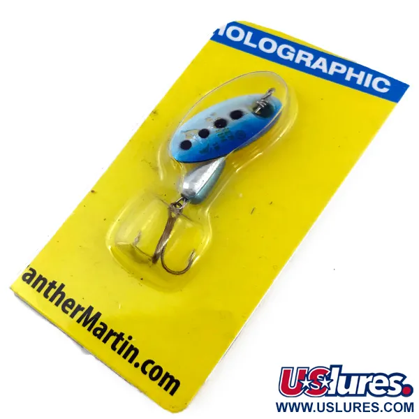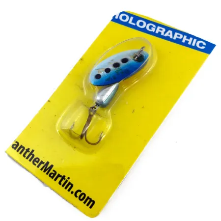 Con un peso di 1/8 oz (4 g), questo cucchiaino Panther Martin 4 è un esempio eccellente della serie Holographic del marchio nella colorazione Blue Trout. La pala olografica presenta quattro distinti punti scuri su una finitura blu sfumata, progettata per riflettere la luce da ogni angolazione. Lungo 1 3/4" (4,5 cm), l'artificiale sfrutta il celebre design a pala montata sull'asse, dove la pala ruota direttamente sull'asta anziché su un gancetto. Questo esemplare, identificato dal codice prodotto 5007, è conservato in condizioni immacolate nella sua confezione originale su cartoncino giallo. Il corpo argentato a forma di goccia è zavorrato per favorire la distanza di lancio in piccoli corsi d'acqua. Sul retro della confezione, le informazioni indicano Harrison Hoge Industries di Port Jefferson, NY, con produzione in Repubblica Dominicana. L'affilato amo triplo è fissato dietro il corpo appesantito.