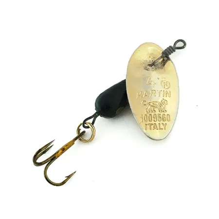 L'iconico logo del leone e la scritta "ITALY", stampati direttamente nel metallo con finitura dorata, distinguono questo autentico Panther Martin 4 di fabbricazione italiana. Questo cucchiaino rotante da 4 g (1/8 oz) presenta il caratteristico corpo a forma di goccia, rifinito con una base nera ad alto contrasto e vistosi punti gialli. Con una lunghezza di 4 cm (1 1/2") dall'occhiello all'amo, la costruzione evidenzia l'esclusivo design in-line del marchio, dove la paletta è montata direttamente sull'asse senza cavalletta. La paletta stessa reca inciso il numero 1009560 e il nome Martin, assicurando la sua appartenenza alla stirpe di questi classici artificiali da trota. Un'ancora affilata è fissata da un robusto anello spaccato, a dimostrazione della qualità della minuteria originale. Catalogato con il codice prodotto 8985, questo esemplare è in condizioni superbe, con una valutazione di 5/5 per la verniciatura nitida e le superfici metalliche brillanti.