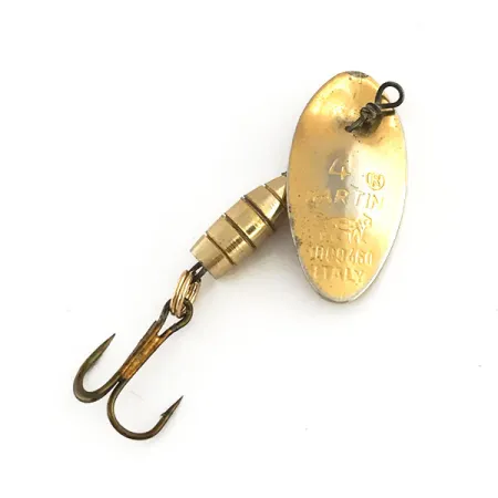 Chiaramente impresso sulla paletta convessa dorata si trovano la designazione della taglia '4' e il marchio di origine italiana, che identifica questa produzione come un classico europeo. Con una misura di 4 cm (1 1/2") e un peso di 4 g (1/8 oz), questo Panther Martin 4 (codice prodotto 9120) è costruito attorno al design in-line distintivo del marchio, dove la paletta è montata direttamente sull'asse metallico senza cavallotto. Il corpo in ottone è segmentato in una forma a goccia appesantita, che garantisce stabilità durante il lancio e il recupero. La componentistica è rifinita con un amo tripletta bronzato fissato da un piccolo anello spaccato alla base dell'asse. Questo esemplare è in condizioni 5/5, presentandosi eccezionalmente pulito con una finitura dorata brillante e uniforme su tutti i componenti metallici. I collezionisti cercano spesso queste versioni 'Made in Italy' per la lavorazione precisa del corpo zavorrato e l'eredità storica della prima produzione del marchio. L'asse passante rimane dritto e correttamente teso.