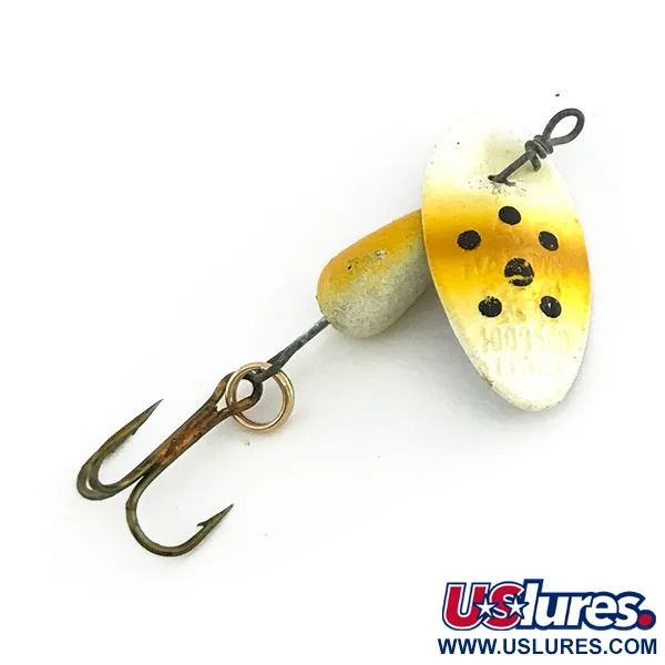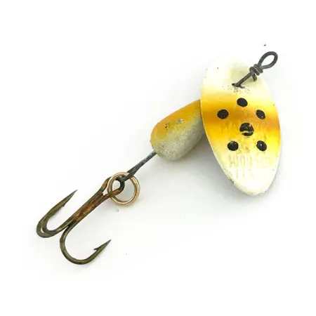 Con la dicitura "MADE IN ITALY" impressa sulla pala, questo cucchiaino rotante rappresenta l'artigianato classico del marchio Panther Martin. Questo esemplare da 4 g (1/8 oz), codice prodotto 9264, presenta l'iconica costruzione ad asse passante in cui la pala ruota direttamente sul filo senza cavalletta. Lungo 4 cm (1 1/2"), è rifinito nella livrea "Brown Trout", che consiste in una sfumatura gialla e crema punteggiata da distinti puntini neri sia sulla pala che sul corpo appesantito. La minuteria include l'asse metallico originale, un anellino spaccato dorato e un amo triplo bronzato. Valutato in condizioni 5/5, la vernice sul corpo in piombo a goccia rimane nitida e ben definita. Questo modello specifico è progettato per la pesca leggera, destinato principalmente al lancio in piccoli ritagli di corrente.