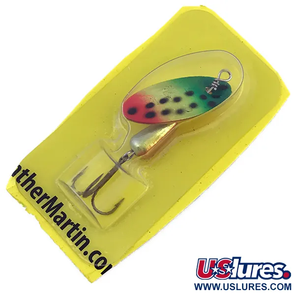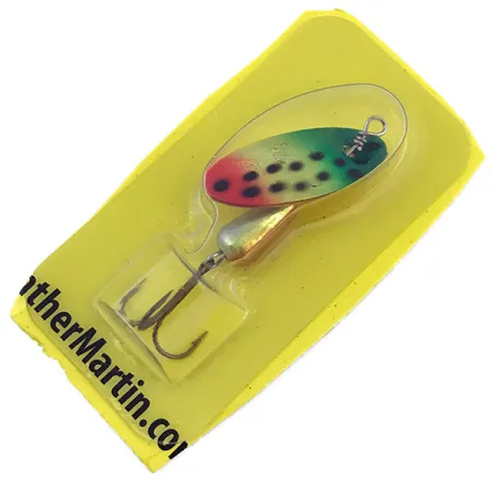 Verniciato con una vivace livrea trota iridea, questo cucchiaino rotante Panther Martin 4 UV presenta una distintiva finitura UV-reattiva per la massima visibilità. Con un peso di 4 g, utilizza il classico corpo a goccia del marchio per lanci stabili. La pala è montata direttamente sull'asse, un design esclusivo che permette alla rotazione di avvenire senza la necessità di una staffa separata. Lungo 4,5 cm, questo esemplare (codice prodotto 4996) è conservato nel suo blister originale. Essendo un pezzo mai usato, la sua condizione è valutata 6. Osservando la pala, il gradiente fluorescente sfuma da un rosso caldo a un verde freddo, punteggiato da macchie scure. L'ancoretta in bronzo è fissata saldamente al corpo zavorrato, prodotto nella Repubblica Dominicana. Il cartoncino giallo è ancora brillante e riporta il sito PantherMartin.com e i contatti della Harrison Hoge Industries di Port Jefferson, NY.