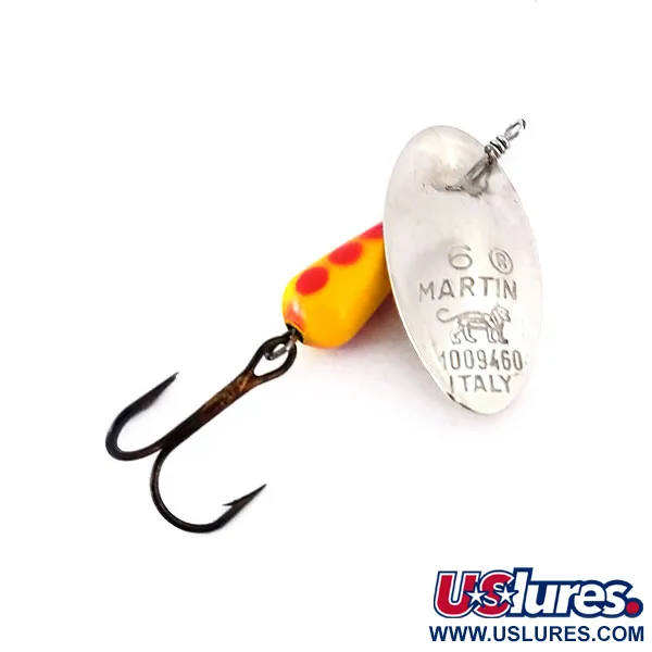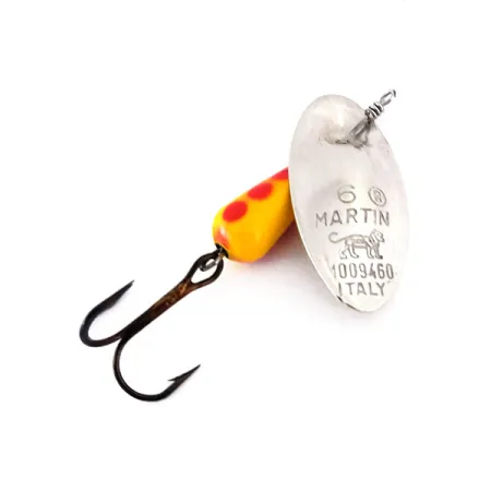 Sul petalo in nickel è chiaramente stampigliato il marchio "ITALY", segno distintivo di questi primi rotanti di produzione europea. Questo Panther Martin 6 pesa 3/16 oz (6 g) e presenta l'iconica costruzione con paletta passante sull'asse, che lo differenzia dai classici rotanti con cavalierino. La paletta stessa è goffrata con un logo vintage del leone e il numero di brevetto 1009460, a testimonianza delle sue radici storiche. Con una lunghezza totale di 2 1/4" (5,5 cm), l'esca è costruita attorno a un vivace corpo a goccia giallo decorato con distinti punti rossi. La finitura in nickel della paletta rimane brillante, mentre il retro monta un'ancoretta pulita con il suo rivestimento scuro originale. Classificato con una condizione di 5/5, l'armatura è dritta e la verniciatura sul corpo è incredibilmente nitida. Poiché la paletta è montata direttamente sul filo, offre un profilo di rotazione unico che ha reso questo modello un punto fermo per i pescatori di trote per decenni. Questo esemplare, registrato con il codice prodotto 10141, mostra la precisione artigianale tipica dell'era manifatturiera italiana del marchio.