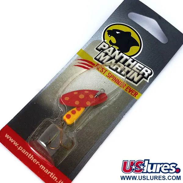 Con un peso di 6g (3/16oz), questo cucchiaino rotante di produzione italiana presenta una colorazione Rosso/Giallo (RY) ad alto contrasto, con una palletta rossa a pois gialli abbinata a un corpo a goccia giallo con dettagli rossi. Lungo 5cm (2"), questo esemplare riporta il codice 10323 e monta l'ancoretta originale con finitura bronzata. Il design utilizza il caratteristico montaggio della palletta direttamente sull'asse tipico di Panther Martin, che permette alla palletta di ruotare direttamente sul filo senza l'uso di un cavalierino. L'esca è nuova, conservata nel suo blister originale che ne riporta l'origine e il peso di 6 grammi. Storicamente, il corpo compatto a goccia è stato progettato per fornire una distribuzione equilibrata del peso, favorendo la distanza di lancio controvento o in acque a corrente veloce. Il retro della confezione conferma il codice colore e l'iconico marchio "Best Spinner Ever" risalente al periodo della produzione italiana.
