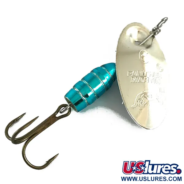 Segmenti metallici color ottanio formano il corpo zavorrato di questo cucchiaino vintage, fornendo un vivace tocco di colore contro la palletta in argento lucido. La palletta stessa è montata direttamente sull'asse, una scelta di design distintiva introdotta da Panther Martin per garantire una rotazione costante. Identificato dal codice prodotto 4409, questo esemplare da 3/16 oz (6 g) mette in mostra la classica maestria italiana con la scritta stampata "PANTHER MARTIN" e il riconoscibile logo del gatto che salta. Due piccole perline dorate fungono da distanziatori tra la palletta e il corpo ciano, che ha una lunghezza totale di 2" (5 cm). Questo specifico artificiale è inutilizzato, mantenendo la finitura originale di fabbrica e la lucentezza per una valutazione di stato pari a 6. Un'ancoretta affilata è fissata all'armatura, pronta per l'acqua o per la vetrina di un collezionista.