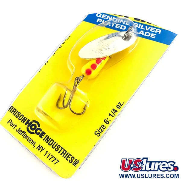 Con un peso di 1/4 oz (7 g), questo classico cucchiaino rotante misura 6 presenta il caratteristico design a pala passante Panther Martin che consente una rotazione immediata. Il corpo a goccia verniciato di giallo è decorato con tre distinti punti rossi, una combinazione di colori che è stata un punto fermo per i pescatori di trote e pesci di mare per decenni. La pala placcata in vero argento è singolarmente concava per essere montata direttamente sull'asse metallico da 5 cm (2") senza la necessità di un cavalierino. Questo specifico esemplare, identificato dal codice prodotto 4581, è conservato nella sua confezione originale Harrison-Hoge Industries di Port Jefferson, NY. Prodotto nella Repubblica Dominicana, l'esca è classificata con condizione 6 e rimane inutilizzata all'interno del blister. La costruzione del corpo zavorrato è progettata specificamente per facilitare la distanza di lancio sia in acque ferme che correnti.