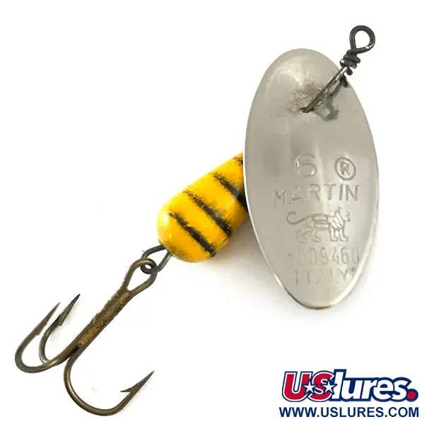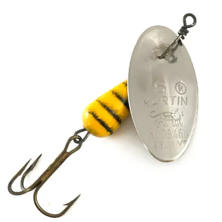 La marcatura "6 MARTIN" impressa chiaramente sulla pala in nichel, accompagnata dal classico logo del leone, ne attesta l'autentica origine italiana. Questo specifico esemplare, catalogato con il codice prodotto 6329, presenta il tipico corpo a goccia verniciato in un giallo vibrante con distinte strisce orizzontali nere. Valutato 5/5, l'artificiale è in condizioni eccezionali, mantenendo la finitura originale di fabbrica sia sul corpo zavorrato che sulla pala in nichel lucido. Con un peso di 6g (3/16oz) e una lunghezza di 5cm (2"), il design sfrutta una configurazione in-line in cui la pala è montata direttamente sull'asse metallico senza cavalierino. Il retro della pala riporta il numero di brevetto 1039460 ed è inciso profondamente con la scritta "ITALY", riflettendo l'epoca di produzione di queste prime importazioni. Un'ancoretta scura e affilata è montata in coda, completando questa esca classica destinata a lanci di precisione in torrenti da trota o per lo spinning leggero in acque interne.