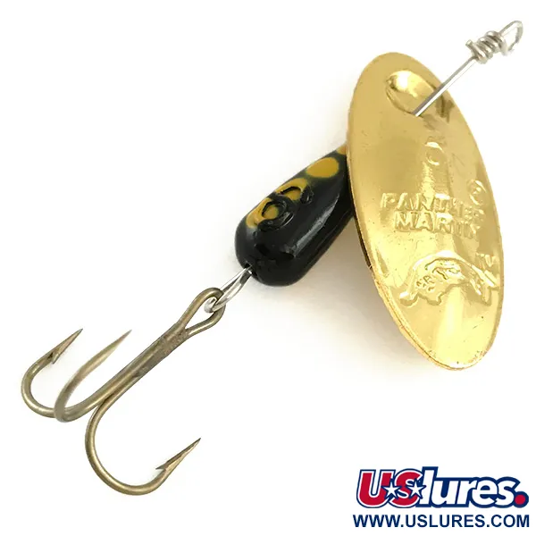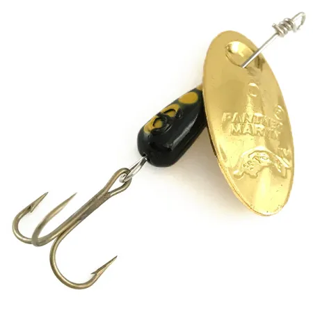 Stampati direttamente sulla paletta dorata convessa si trovano l'iconico logo del pesce, il nome "PANTHER MARTIN" e la misura "6". Questo specifico esemplare, identificato dal codice prodotto 6511, presenta il caratteristico design in-line in cui la paletta ruota direttamente sull'asse senza cavalierino. Con una lunghezza di 5 cm (2") e un peso di 6 g (3/16 oz), l'esca è bilanciata da un corpo appesantito a goccia nero con tre vivaci punti gialli. Prodotto in Italia, questo rotante è armato con un'affilata ancoretta in finitura bronzo. Come oggetto da collezione mai usato, il rotante mantiene la sua lucentezza originale di fabbrica.