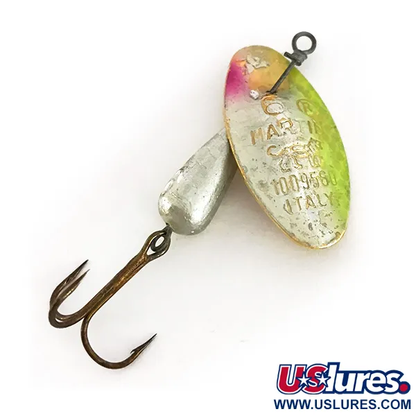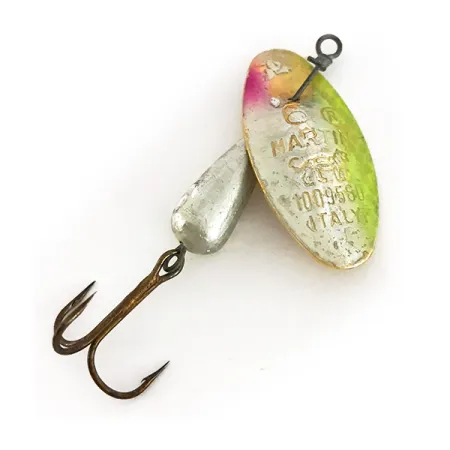 L'incisione sulla paletta con finitura argentata indica l'origine italiana e fa riferimento al brevetto statunitense 1.009.560, segno distintivo di questi classici cucchiaini rotanti. Questo esemplare da 5,3 g (3/16 oz) presenta il caratteristico corpo a goccia lasciato in finitura metallica grezza, bilanciando la lunghezza totale di 5 cm (2"). Sul fronte, la paletta mostra una vivace sfumatura Rainbow Chartreuse e rosa su argento, mentre il retro rivela una tonalità ottone lucido. Una piccola perla di ottone funge da cuscinetto tra la paletta e il corpo zavorrato sulla struttura passante. L'ancoretta mostra che gli ardiglioni sono stati schiacciati, probabilmente per l'uso in acque da trofeo con regolamenti catch-and-release. Classificato con una condizione 4/5, l'esca mostra una leggera usura pur mantenendo un occhiello avvolto funzionale. La paletta è montata direttamente sull'asse, un design distintivo che massimizza la vibrazione contro il corpo zavorrato.