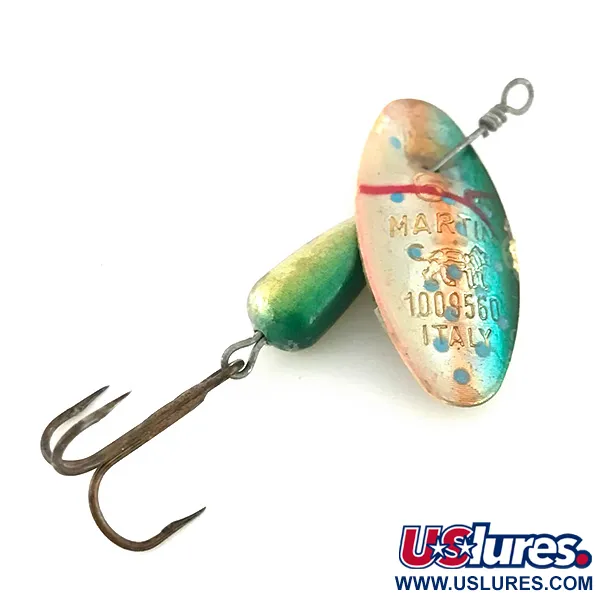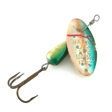 La punzonatura sulla pala argentata conferma questo Panther Martin 6, codice prodotto 8536, originario dell'Italia, con il caratteristico logo del leone e il numero di brevetto 1009560. Con un peso di 3/16 oz (6 g) e una lunghezza di 2 1/4" (5,5 cm), questo esemplare mostra il classico corpo a goccia con una sfumatura dal verde all'oro. La pala dal design unico, che passa direttamente attraverso l'asse metallico senza l'uso di un cavallotto, presenta una finitura Blue/Silver con distinti punti blu e un perimetro color verde acqua. Questo montaggio diretto sull'asse è un segno distintivo dell'ingegneria del marchio, progettato per una rotazione aderente al corpo. Conservato in condizioni valutate 5/5, la componentistica rimane integra con un'ancoretta originale dai toni scuri. Le versioni di questi rotanti prodotte in Italia sono molto apprezzate dai collezionisti per la precisione della punzonatura e le specifiche transizioni di colore.