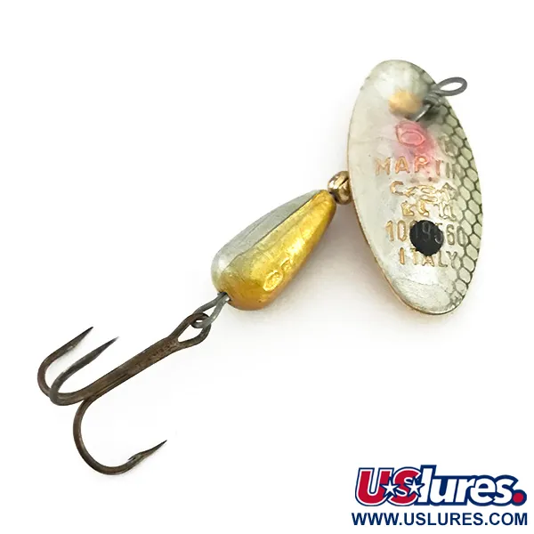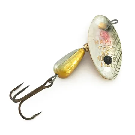 Con la scritta "Italy" impressa sulla sua caratteristica pala, questo esemplare mette in mostra la maestria artigianale che ha contribuito a costruire la reputazione del marchio Panther Martin. Con un peso di 3/16oz (6g) e una lunghezza di 2 1/4" (5,5cm), questo rotante misura 6 presenta l'iconico design della pala montata direttamente sull'asse, che consente la rotazione senza il cavalierino. La finitura della pala è particolarmente suggestiva, con un motivo a scaglie a nido d'ape argentato su un lato e un sottile accento arcobaleno vicino all'occhiello, mentre il retro rivela una liscia lucidatura dorata. Il corpo a goccia appesantito ha una finitura distinta, divisa tra una metà superiore argentata e una metà inferiore dorata. Identificata dal codice prodotto 8539, questa esca è dotata di un'ancoretta pulita e non mostra quasi alcun segno di usura, guadagnandosi una valutazione di 5/5. I collezionisti apprezzeranno le marcature chiare e in rilievo tra cui "MARTIN" e "ITALY" visibili sulla faccia argentata. L'assemblaggio rimane saldo e l'asse metallico è dritto, tipico di questi modelli prodotti in Italia progettati per lanci precisi in torrenti da trote o fiumi minori.
