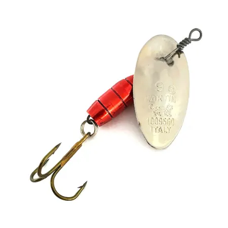 Chiaramente stampati sulla pala in nickel sono la dimensione e l'origine italiana, che contrassegnano questo artificiale come un pezzo autentico della storia della pesca. Questo specifico esemplare, catalogato con il codice prodotto 8964, presenta l'iconico corpo a goccia rifinito in un rosso vivace con striature nere. Con un peso di 11g (2/5oz) e una lunghezza di 5,5cm (2 1/4"), è ben bilanciato per lanci profondi in correnti sostenute. Il design della pala in-line è un marchio di fabbrica del brand Panther Martin, dove il filo passante attraversa direttamente la pala in nickel anziché utilizzare un cavalierino. Questa costruzione aiuta l'esca a entrare in rotazione immediatamente dopo l'impatto con l'acqua. Una singola perla in ottone funge da spaziatore tra il corpo rosso e la pala, mentre un robusto amo triplo dorato è posto in coda. Mantenuto in condizioni 5/5, la finitura rimane brillante e le incisioni sono nitide, riflettendo l'eredità della qualità produttiva italiana originale.