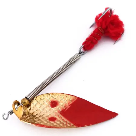 Un motivo a scaglie in rilievo adorna la pala placcata oro di questo cucchiaino rotante di produzione italiana, rifinito con una punta rossa e due distinti punti rossi. Il Panther Martin Francese Tirlindada con Lana, con codice prodotto 10549, presenta un corpo specializzato in cui un’anima di filo metallico è racchiusa in una molla metallica strettamente avvolta. Con un peso di 5g (3/16oz) e una lunghezza di 7cm (2 3/4"), l'esca è dotata di un amo triplo guarnito con spessa lana rossa. Questa finitura in lana è una scelta di design classica per la serie Tirlindada, pensata per offrire un profilo morbido in acqua. La pala a foglia di salice è montata direttamente sull'asse, un segno distintivo del produttore per facilitare la rotazione anche a basse velocità di recupero. Questo esemplare è inutilizzato, mostrando la finitura lucida e pulita dello stato originale di fabbrica.