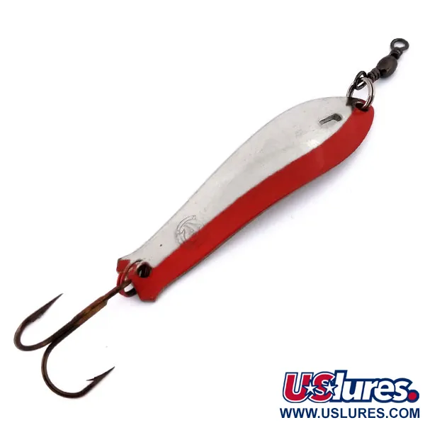 Lungo 6 cm, questo cucchiaino ondulante di produzione italiana è un classico esempio della serie Lampo Pesante da Lancio di Panther Martin. Il corpo con finitura nichelata è impreziosito da una vivace striscia rossa lungo un bordo, che crea un netto contrasto cromatico con il metallo lucido. Con un peso di 11 g, lo spessore dell'artificiale è studiato per lanci a lunga distanza e per raggiungere gli strati d'acqua più profondi dove ondulanti più leggeri tenderebbero a sfarfallare troppo in superficie. Un piccolo marchio del produttore è visibile sulla faccia, a conferma dell'origine e del prestigio del brand. La configurazione prevede una girella a bariletto montata in testa per gestire le torsioni del filo e un robusto amo triplo fissato da un anellino spaccato in coda. Questo esemplare è in condizioni eccellenti (5/5), con la superficie nichelata riflettente e gli accenti dipinti che risaltano perfettamente insieme all'ancoretta originale con finitura bronzo.