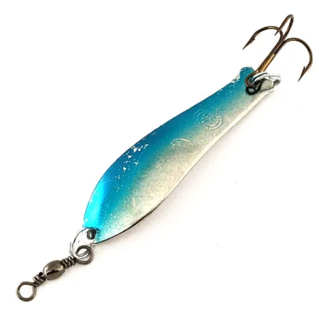 Il retro nichelato abbinato a un vivace gradiente blu-argento sulla faccia definisce questo classico cucchiaino ondulante da lancio di produzione italiana. Questo Panther Martin Lampo Pesante da Lancio pesa 11 g (2/5 oz) e misura 6 cm (2 1/4"), fornendo il peso necessario per lanci a lunga distanza e per raggiungere le zone di stazionamento più profonde. Identificato dal codice prodotto 12251, il cucchiaino riflette la qualità delle sue origini manifatturiere europee. Sebbene questo esemplare sia inutilizzato, sono visibili lievi segni superficiali dovuti alla lunga conservazione sul lato verniciato, come comune per l'attrezzatura vintage di quest'epoca. L'esca è equipaggiata con componentistica originale, dotata di una girella barrel con finitura scura all'attacco e un'ancoretta bronzata in coda. Questa specifica combinazione di colori, che unisce il riflesso del nichel alla sottile transizione verso il blu, lo rende un pezzo degno di nota per i collezionisti di ondulanti Panther Martin vintage.