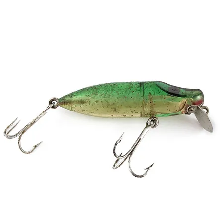 Tonalità di verde sfumano in un ventre color oro caldo in questo esemplare di fabbricazione americana della Paw Paw Bait Company. Con una lunghezza di 7,5 cm (3") e un peso di 12 g (2/5 oz), il Master Wiggler è considerato una rarità significativa per i collezionisti. Il design presenta una distintiva paletta in metallo e una configurazione a due ami, con il codice prodotto 21665 che identifica questo specifico articolo. La sua costruzione mette in mostra la classica ferramenta a vite utilizzata durante la sua epoca di produzione a Paw Paw, nel Michigan. La finitura mantiene un alto grado di integrità su tutto il corpo, con una valutazione dello stato pari a 5/5. Sia l'ancoretta ventrale che quella posteriore rimangono solide, evidenziando il design funzionale tipico di queste esche vintage in legno.