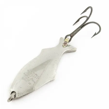 Una robusta placcatura in nichel ricopre il corpo da 7 cm di questo classico ondulante da casting. Questo Pflueger Last Word, identificato dal codice prodotto 24224, pesa esattamente 14 g. Le incisioni stampate sul lato concavo sono nitide e indicano chiaramente l'origine "Made in USA" insieme al nome del modello. La componentistica include una robusta ancoretta fissata tramite un solido anellino metallico in coda, oltre a un occhiello dedicato per l'attacco della lenza in punta. In condizioni 4 su 5, le superfici metalliche sono pulite e la struttura complessiva rimane solida. Il corpo presenta una sottile silhouette a forma di pesce, con un evidente allargamento verso il centro e un profilo affusolato verso la parte posteriore.