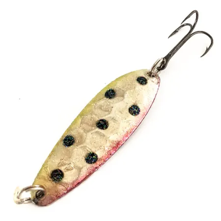 La trama a nido d'ape martellata crea riflessi complessi sulla superficie argentata di questo ondulante Pirate Lures, un artificiale di qualità prodotto negli USA. Con una lunghezza di 6,5 cm (2 1/2") e un peso di 12 g (2/5 oz), il modello Pirate Joe's Silver Plated è bilanciato per la massima versatilità in acqua. La livrea presenta una tonalità verde-giallo chiaro sul dorso e una sfumatura rosa-rossa sulla pancia, accentuata da sette punti neri glitterati che creano punti di contrasto sulla base argento. Il lato posteriore evidenzia la brillante placcatura in argento e la profondità del motivo a scaglie stampato. Dotato di anelli spaccati originali e di un'ancoretta affilata, questo esemplare (codice 12483) è in condizioni 5/5. La finitura argento rimane lucente, mettendo in mostra l'artigianato tipico dei design vintage Pirate Lures destinati allo spinning e alla traina.
