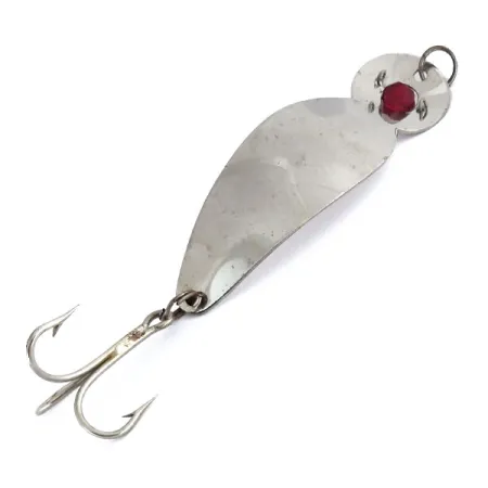 Gli occhi in gemma rossa, incastonati con precisione nella testa del corpo metallico da 10 cm, conferiscono a questo ondulante vintage un aspetto molto diverso dalle moderne attrezzature prodotte in serie. Chiaramente stampato con il nome del modello sul retro, il Popeye (Codice Prodotto 9840) presenta una finitura in nichel lucidato che mantiene una qualità brillante e riflettente. Con un peso solido di 28 g, il corpo metallico è sagomato con una curvatura sottile, progettata per la distanza di lancio e la stabilità in acqua. La configurazione hardware consiste in un robusto amo triplo e anelli spaccati sia in testa che in coda, tutti in uno stato ben conservato che riflette una valutazione di 4/5. Questo ondulante rappresenta un'epoca specifica del design statunitense, dove la lavorazione funzionale del metallo incontrava un tocco decorativo. La superficie in nichel è pulita, mostrando solo i più lievi segni del tempo coerenti con un articolo conservato con cura.