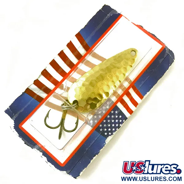 La finitura in oro martellato sul corpo da 4,5 cm (1 3/4") conferisce a questo ondulante Rainbow Plastics Pot-O-Gold un profilo riflettente inconfondibile. Contrassegnato dal codice prodotto 4641, questo esemplare pesa 7 g (1/4 oz) e rappresenta un'era classica della produzione americana di articoli da pesca sotto il marchio Double X Tackle. L'esca è inutilizzata, montata sul suo cartoncino patriottico originale rosso, bianco e blu con motivo a stelle e strisce. La componentistica consiste in un'ancoretta bronzata unita all'ondulante tramite un robusto anellino spaccato, mentre il corpo in metallo stampato presenta un unico foro di attacco pulito sulla testa più stretta. Il retro della confezione mostra il marchio Double X Tackle insieme ai riferimenti ad altri loro celebri prodotti, tra cui l'Ajust-A-Bubble e il Torpedo Float.