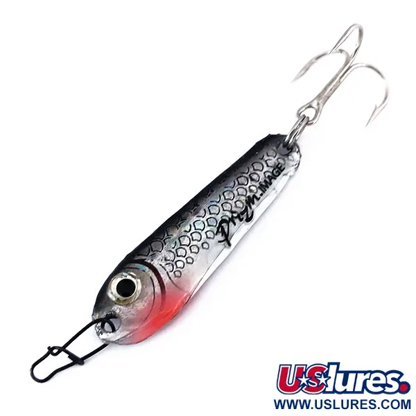 Con una lunghezza di esattamente 5 cm (2"), il Prizm Image di Wahoo presenta un corpo in metallo denso con base argento e un intricato motivo a scaglie nere lungo i fianchi. Un vivace accento rosso sulla gola crea un forte contrasto con la finitura prismatica riflettente, completata da un grande occhio realistico per un maggiore richiamo visivo. Questo esemplare, identificato dal codice prodotto 10045, è in condizioni eccellenti con una valutazione di 5/5, senza segni di usura sulle superfici lucide. Realizzato negli Stati Uniti, l'esca pesa 14 g (1/2oz) e viene fornita con una girella con moschettone montata in fabbrica e un amo triplo affilato fissato da un robusto anello spaccato. Il marchio distintivo "Prizm Image" è stampato chiaramente sul fianco, garantendo l'autenticità per i collezionisti di esche in metallo vintage.