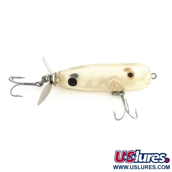 Una singola elica color argento è posizionata nella parte posteriore di questo classico walker topwater, progettata per agitare la superficie durante un recupero costante. Con un peso di 9,5 g (1/3 oz) e una lunghezza di 6,5 cm (2 1/2"), questo modello presenta un corpo in plastica completamente trasparente che rivela le sfere rattling interne responsabili del suo profilo sonoro. Identificato dal codice prodotto 7917, l'esca è una creazione distintiva dell'azienda americana The Producers. Il suo richiamo visivo è evidenziato da grandi occhi dipinti ad alto contrasto, che forniscono un bersaglio chiaro per i predatori che attaccano in superficie come bass e lucci. L'attrezzatura è composta da due ancorette — una montata sulla pancia e una che segue l'elica — collegate a un telaio arrotondato a forma di sigaro. Questo esemplare ben conservato non mostra segni di utilizzo, con una valutazione delle condizioni di 5/5.