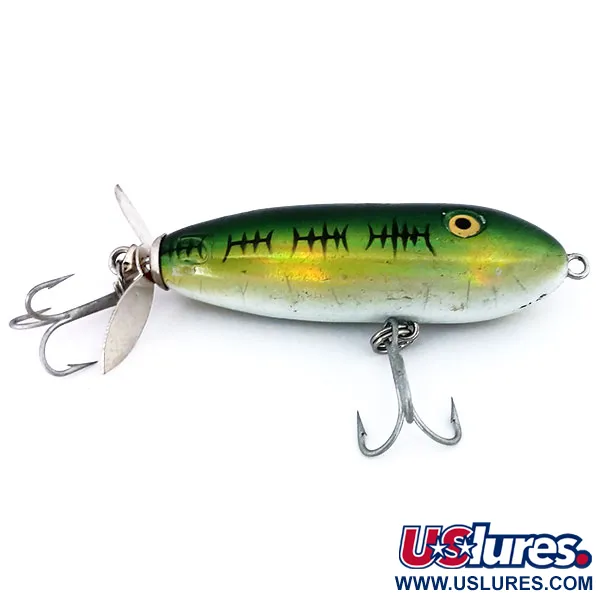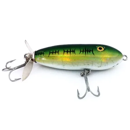 Le finiture verde arcobaleno sulle esche americane vintage mostrano spesso una transizione sorprendente dai toni profondi della foresta a un oro scintillante, e questo Producers Turbo ne è un esempio lampante. Con una lunghezza di 6 cm (2 1/4") e un peso versatile di 9 g (1/3 oz), questa esca di superficie presenta un distintivo motivo a lisca di pesce nera stratificato sui fianchi iridescenti. Il corpo galleggiante a forma di siluro è dotato di un'elica argentata montata posteriormente. Questa elica è fissata da un robusto occhiello a vite che ancora anche l'ancoretta di coda, mentre una seconda ancoretta è posizionata a metà pancia per garantire allamate sicure su lucci e persici. Con il codice prodotto 10597, l'esca rimane in ottime condizioni con una valutazione di 4/5, mostrando solo piccoli segni della sua storia di pesca. I grandi occhi gialli dipinti offrono un punto focale ad alto contrasto contro la testa verde scuro. Come esca topwater galleggiante, la componentistica è progettata per la presentazione in superficie dove la pala posteriore crea turbolenze localizzate durante un recupero costante.