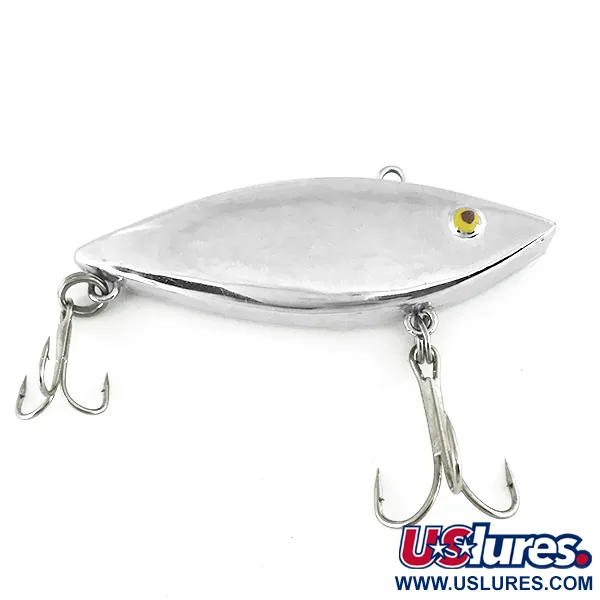Le finiture a specchio come quella su questo corpo da 6,5 cm (2 1/2") sono state progettate per produrre il massimo bagliore anche in acque torbide. Questo Producers Zero Tyrone Boomer Wells, codice prodotto 7187, è un'esca affondante e rumorosa, specificamente realizzata per insidiare specie come persici e sandre. Con un peso di 8,5 g (1/3 oz), il profilo compatto prodotto negli USA consente lanci efficienti e il raggiungimento di zone profonde. La componentistica consiste in due ancorette fissate tramite anellini spaccati, e l'attacco della lenza superiore indica un design lipless studiato per presentazioni affondanti. La superficie Mirror altamente riflettente è rifinita da un classico occhio giallo con pupilla scura, che garantisce un'elevata visibilità. Questo esemplare è in condizioni 5/5 e non è mai stato usato, con l'esterno cromato e la componentistica che non mostrano segni di usura.