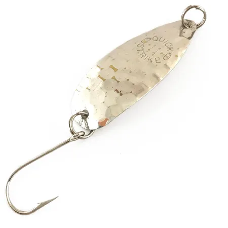 Una texture argento martellata definisce il profilo visivo di questo ondulante da traina da 5,2 cm (2"), progettato per riflettere la luce in modo efficace durante un recupero costante. Chiaramente marchiato con il logo Quickstrike sulla faccia, questo esemplare prodotto negli USA, catalogato con il codice 4706, è in condizioni eccellenti con una valutazione di 5/5. Con un peso di 2,5 g (3/32 oz), l'esca presenta una struttura robusta con un amo singolo grande collegato tramite un anellino spaccato argentato. La forma a goccia allungata è specificamente studiata per le applicazioni a traina. La finitura metallica mantiene la sua lucentezza originale sulla superficie martellata, e un secondo anellino spaccato è posizionato sulla testa per un fissaggio sicuro della lenza.