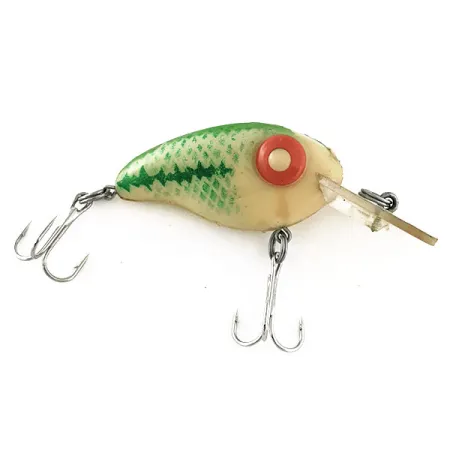 Sfumature bianche, verdi e rosse definiscono l'estetica di questo Rabble Rouser Ashley, un cimelio della storia della pesca diventato sempre più difficile da trovare dopo la fine della produzione. Con un peso di 1/3 di oncia (10g), offre una sensazione di solidità per il suo corpo compatto da 2" (5cm). L'iconico grande occhio rosso risalta sul corpo bianco crema, rifinito con un motivo a squame verdi meticolosamente applicato lungo il dorso. Con il codice 11386, questa esca galleggiante prodotta negli USA presenta componenti originali e una paletta trasparente caratteristica del design di metà secolo del marchio. Le condizioni sono ottime per un reperto vintage, classificate 4/5, con lievi segni del tempo pur mantenendo l'integrità di vernice e ami. Questo esemplare rappresenta un'epoca classica della produzione americana di attrezzatura da pesca, che puntava su una struttura robusta e forti richiami visivi.