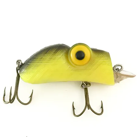 Il tratteggio incrociato giallo e nero sul dorso identifica immediatamente questo Rabble Rouser Rouster come un esempio storico dell'attrezzatura americana. Lungo 5,5 cm (2 1/4") e con un peso solido di 13 g (1/2 oz), questo modello 6658 è progettato sia per il lancio che per la traina. Gli occhi gialli sovradimensionati con le pupille nere centrate conferiscono all'esca il caratteristico aspetto con occhi a palla che i collezionisti riconoscono in questo marchio. Essendo un modello galleggiante e rumoroso, è in grado di raggiungere profondità di 3,5 m (11,5 ft) durante il recupero. La paletta trasparente a gradini e i due ami tripli appaiono in ottima forma, riflettendo la sua valutazione di condizione 5/5. Poiché tutte le esche di questo produttore sono state realizzate esclusivamente negli Stati Uniti, la fattura mantiene una qualità robusta adatta a insidiare lucci o perca.