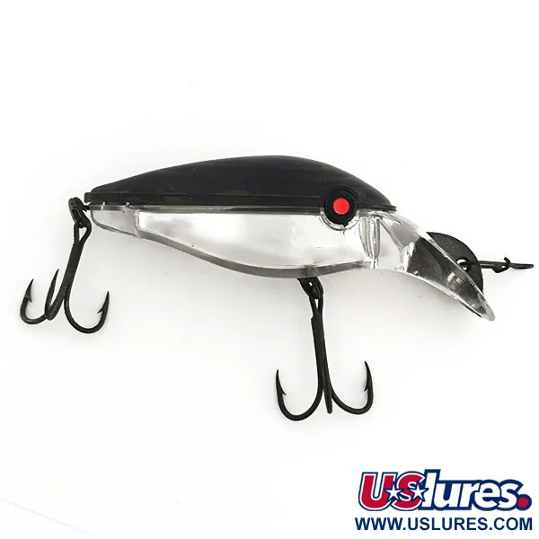 Caratterizzata da un forte contrasto bicolore, la metà superiore nera opaca di questo corpo in plastica passa a una sezione inferiore trasparente. Questo Rebel Blackstar, con codice prodotto 9233, è una scoperta degna di nota per i collezionisti di attrezzatura americana. Il design incorpora una coppia di ancorette nere e una paletta trasparente integrata direttamente nel muso. Ogni occhio presenta una pupilla rosso acceso che risalta sulla testa scura. Con una dimensione di 6 cm (2 1/4") e un peso di 14 g (1/2 oz), la struttura dell'esca ospita un rattling interno rumoroso. L'esemplare è in condizioni eccellenti, non mostra segni di utilizzo, con una valutazione dello stato di 5/5. Un moschettone nero è già fissato all'occhiello sulla paletta.