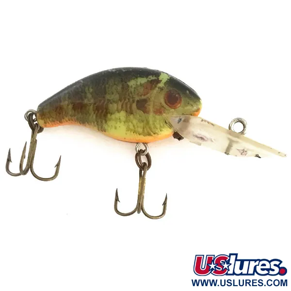 Raggiungendo profondità fino a 2,4 m, il Rebel Deep Teeny R è uno strumento tecnico costruito sia per il lancio che per la traina. Questo esemplare prodotto negli USA pesa 7 g e misura una lunghezza compatta di 4,4 cm. La livrea Bass è particolarmente ben eseguita, con un corpo screziato verde e oro dettagliato, una distinta gola arancione e macchie laterali scure. È dotato di due ancorette affilate e presenta una lunga paletta trasparente dove è posizionato l'attacco della lenza per aiutare il corpo galleggiante a raggiungere la zona target. Contrassegnato con il codice prodotto 9346, le condizioni dell'esca sono un solido 5/5, mostrando una superficie pulita e componenti ben mantenuti. Grandi occhi cerchiati di rosso forniscono un punto focale visivo specifico contro la stampa realistica delle scaglie.