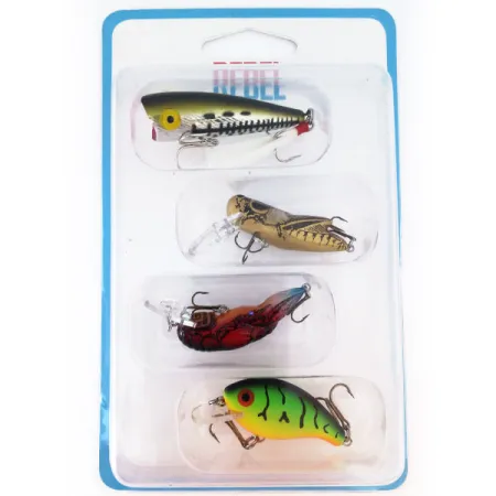 Quattro distinti profili ultraleggeri in condizioni originali mai utilizzate compongono questo Rebel Ultralight Kit, identificato dal codice prodotto 10944. Questa collezione rimane nella sua confezione blister originale, preservando lo stato di fabbrica delle esche. È incluso l'iconico Pop-R da 2" (5 cm), progettato per presentazioni a galla e casting topwater. Il Crickhopper misura 1 1/2" (4 cm) e punta a profondità comprese tra 0,5 e 0,9 m. Per una copertura maggiore, il Teeny Wee-Crawfish — anch'esso da 1 1/2" (4 cm) — raggiunge tra 0,5 e 1,5 m con il suo profilo realistico di crostaceo. Completa il set un Teeny R nella vivace livrea Fire Tiger, un suspender da 1 1/2" (4 cm) che opera nel range da 0,4 a 1,2 m. Ogni modello rappresenta la tradizione del produttore per l'efficacia multi-specie su bass, persici e trote. Il retro della confezione evidenzia la portabilità per piccoli torrenti e grandi laghi. L'hardware è composto da ancorette piccole e affilate, adatte ad applicazioni con fili sottili.