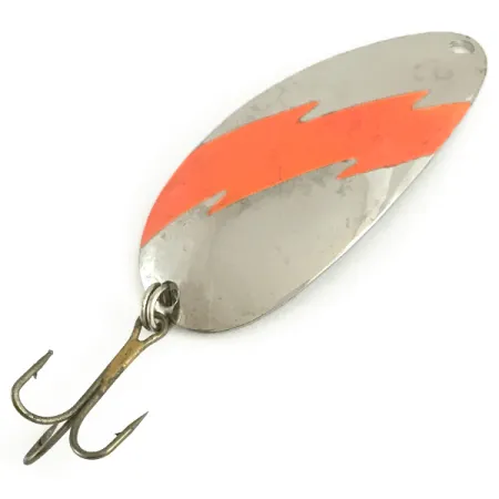 La nichelatura fornisce una base classica ad alta riflettenza per questo ondulante da 10,5 g (3/8 oz), caratterizzato da un distintivo motivo a saetta in arancione fluorescente sul lato convesso. Con una lunghezza di 6 cm (2 1/4"), l'ondulante Red Eye (codice 6626) mette in mostra la precisione della produzione USA, con il marchio Red Eye Lures stampato chiaramente all'interno della parte concava. Questo specifico esemplare da traina è in condizioni 5/5, mantenendo una finitura brillante e riflettente e pigmenti vivaci senza segni di usura significativi. La componentistica consiste in una robusta ancoretta fissata da un resistente split ring, progettato per resistere alle sollecitazioni della traina di profondità. Un punto di attacco pulito sulla punta permette il fissaggio diretto del filo o di una clip, mantenendo il profilo idrodinamico dell'esca.
