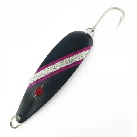 Con una lunghezza di 13 cm (5"), questo ondulante presenta una finitura nero profondo arricchita da vivaci bande diagonali di glitter rosa e argento. Questo Red Eye Evil Eye da 18 g (2/3 oz) è un pezzo classico della storia dell'attrezzatura americana, prodotto da Red Eye Lures negli USA. Il tratto distintivo di questo design è la perla di vetro rosso sfaccettata fissata vicino alla coda, che dà il nome all'esca. I collezionisti apprezzeranno le condizioni 5/5, che mostrano una superficie molto pulita e componenti originali, tra cui un robusto amo singolo e uno split ring anteriore. Identificato dal codice prodotto 23980, il profilo sottile dell'ondulante è progettato per applicazioni a lancio o a traina. La combinazione del corpo scuro con le strisce glitterate ad alto contrasto offre un profilo visivo specifico, spesso utilizzato in condizioni di scarsa luminosità o in acque profonde. La robusta costruzione in metallo e la perla fissata con filo metallico sono tipiche degli standard di produzione durevoli per cui Red Eye Lures era nota durante i suoi anni di attività.