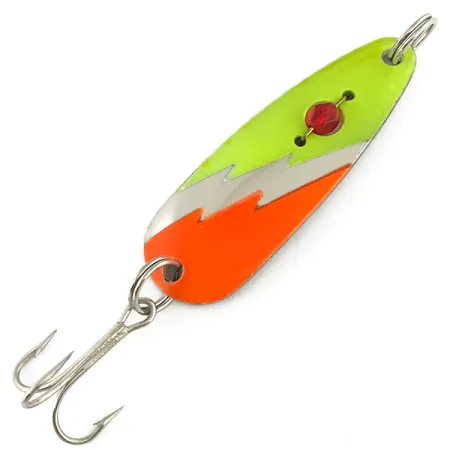 Vernice gialla e arancione incontra una finitura in nickel lucido sulla faccia di questo ondulante da 14g (1/2oz). Sul retro è stampato chiaramente il marchio Red Eye Lures insieme alla sua origine USA, un segno di qualità ricercato dai collezionisti nel modello Red Eye Evil Eye. Questo esemplare specifico, catalogato con il codice 7319, misura 5,7cm (2 1/4") e presenta la caratteristica perla rossa "eye" che dà il nome all'esca e fornisce un punto focale di contrasto visivo. L'armamento è composto da un'ancoretta affilata e doppi anelli spaccati per una connessione affidabile della lenza. Mantenendo una valutazione di condizione 5/5, i colori smaltati sono vivaci e le superfici metalliche mostrano una qualità brillante e riflettente.