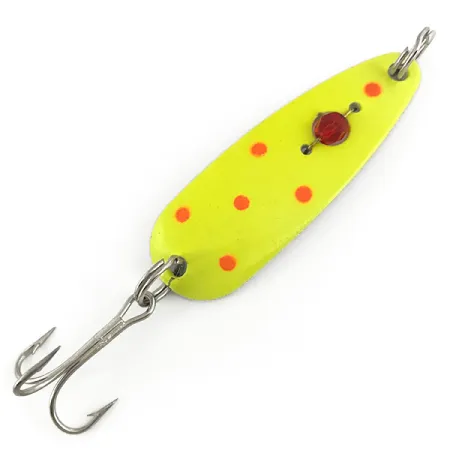 Lungo 5,7 cm (2 1/4"), questo classico cucchiaino ondulante presenta una base gialla vibrante punteggiata da distinti punti arancio-rosa. L'iconica perla rossa sfaccettata è incastonata saldamente al centro del corpo metallico, un elemento di design distintivo dei Red Eye Lures prodotti in America. Con un peso di 14 g (1/2 oz), l'ondulante è costruito per applicazioni versatili di casting pesante o traina. La specifica finitura UV di questo modello Red Eye Evil Eye fornisce una luminosità ad alto contrasto se esposta alla luce ultravioletta. Registrato con il codice 7366, la finitura dell'esca è straordinariamente ben conservata su tutta la superficie. È inutilizzato e rimane in condizioni eccezionali, riflettendo il controllo qualità della produzione originale USA. Un'ancoretta heavy-duty e anelli spaccati in acciaio inossidabile completano la dotazione, assicurando funzionalità sia per il pescatore che per il collezionista.