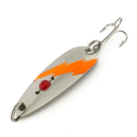 La nichelatura crea uno sfondo ad alta riflettenza per la decalcomania a saetta arancione vibrante di questo Red Eye Lures Evil Eye UV. Identificato dal codice prodotto 7556, questo ondulante da lancio pesa 1/2 oz (14 g) e ha una lunghezza di 2 1/4" (5,7 cm). Un tratto distintivo di questo modello prodotto negli USA è la perla rossa sfaccettata montata nel corpo dell'ondulante vicino all'anello brisè di testa, che cattura la luce in modo diverso rispetto al metallo lucido. Se esposto alla luce ultravioletta, il fulmine arancione fluorescente reagisce con un bagliore intenso, favorendo la visibilità in acque più profonde o scure. L'esca è dotata di un'ancoretta standard e anelli brisè di qualità. Questo articolo specifico è in condizioni nuove, con la finitura originale di fabbrica senza segni di usura.
