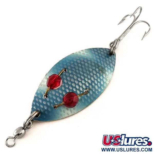 Perle di vetro rosso sfaccettate sono cablate saldamente nel corpo dell'ondulante, fungendo da iconici punti d'attacco che danno il nome all'Hofschneider Red Eye Junior. Con una lunghezza di 5,5 cm (2 1/4") e un peso di 11 g (2/5 oz), questo artificiale specifico, catalogato con il codice prodotto 11330, presenta una vivace livrea a scaglie blu su base argentata. Il retro dell'esca è in nichel lucidato, chiaramente punzonato con il marchio del produttore di Rochester, NY. I pescatori si affidano spesso a questa forma classica per un recupero lento, rendendola un elemento essenziale per insidiare lucci e persici in acque calde. La componentistica comprende una robusta girella in testa e un amo tripletta lucente in coda. Presentato in condizioni valutate 5/5, l'ondulante mantiene la sua lucentezza originale sia sulla faccia verniciata che sul lato metallico inferiore.