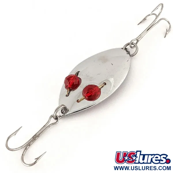 Grandi occhi rossi riflettenti definiscono il fascino visivo di questo cucchiaino nichelato, identificato dal codice prodotto 12440. Con un peso di 13 g (1/2 oz) e una lunghezza di 5,5 cm (2 1/4"), il Red Eye junior della Hofschneider Corp. è un elemento fondamentale dell'attrezzatura vintage americana. Il corpo prodotto negli Stati Uniti è progettato per tecniche che privilegiano un recupero lento, consentendo a lucci e persici di concentrarsi sul bagliore del metallo durante la calura estiva. Due ami tripli affilati sono montati alle estremità dell'esca, fornendo molteplici punti di attacco per i predatori curiosi. Questo esemplare ha una valutazione di condizione 5/5, mostrando una superficie lucida ben conservata e un montaggio sicuro per le perline rosse sfaccettate. La stampigliatura del produttore sul lato concavo rimane nitida e leggibile, confermando la sua eredità come pezzo autentico della storia della pesca di metà secolo.