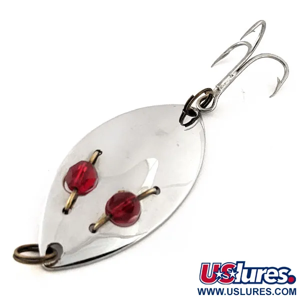 Chiaramente impresso sul retro della nichelatura, il marchio "Red-Eye Spinning Lure" della Hofschneider Corp di Rochester, N.Y., è un simbolo dell'artigianato americano della metà del secolo. Questo modello junior da 5,5 cm (2 1/4") è costruito attorno a un corpo in nichel lucidato che riflette intensamente la luce, attirando l'attenzione dei predatori anche con recuperi lenti. Due perle rosse sfaccettate sono montate saldamente al centro dell'ondulante, fornendo l'iconico stimolo visivo che dà il nome all'esca. Con un peso di 11 g (2/5 oz), è bilanciato per il lancio in svariate condizioni. La componentistica è notevolmente pulita, con split ring ben conservati e un'ancoretta affilata, per una valutazione delle condizioni di 5/5. Identificato dal codice prodotto 12952, le superfici riflettenti dell'ondulante rimangono brillanti, mantenendo quel look ad alto contrasto che ha reso queste esche un classico nelle scatole dei pescatori negli USA.